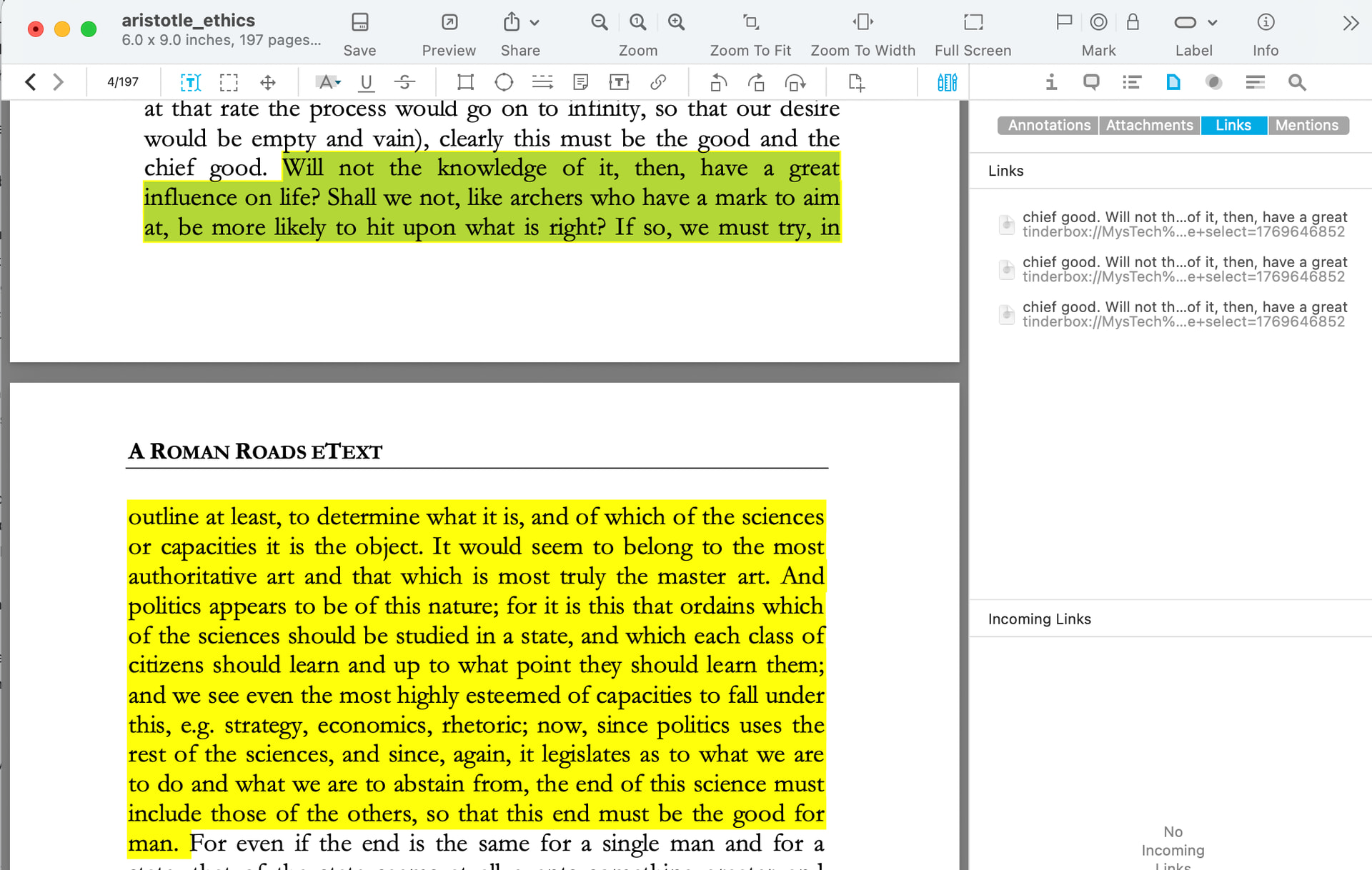 I’m working through some tinderbox documents from which I link to selections within various PDFs in DevonTHINK. When I click the selection link I then use ‘add link’ to paste a back reference to Tinderbox. The links inspector shows a link for every line in the selection. Selecting any of the links in the inspector highlights selection. Is there a way to add a link to a selection without adding redundant links?