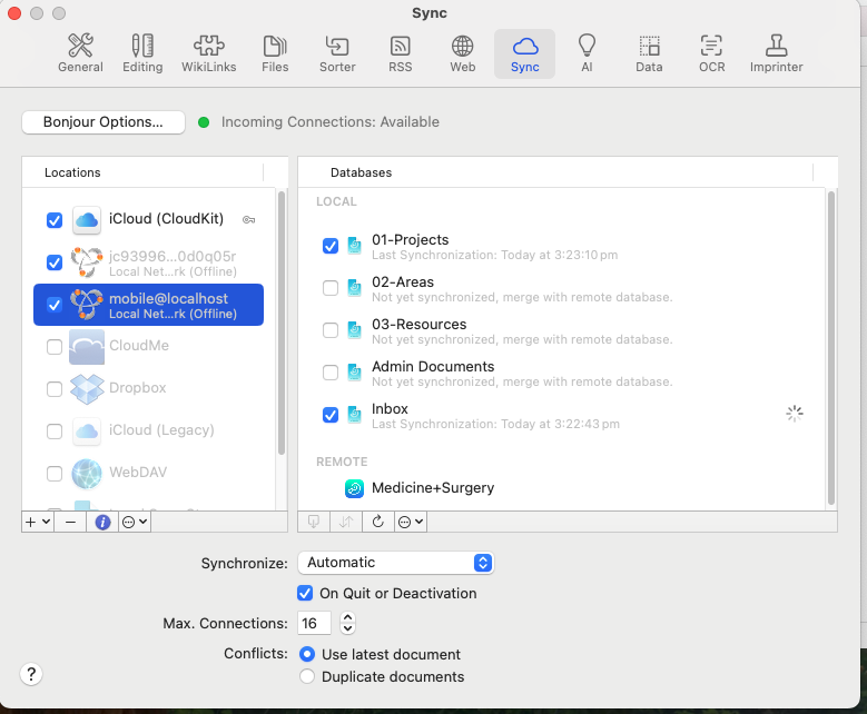 Regarding sync, you should not have Bonjour enabled in DEVONthink To Go. DEVONthink is acting as the Bonjour server. This is covered in the In & Out > Sync:Bonjour section of DEVONthink’s and DEVONthink To Go’s Sync > Sync:Bonjour sections of their built-in Help and manuals.