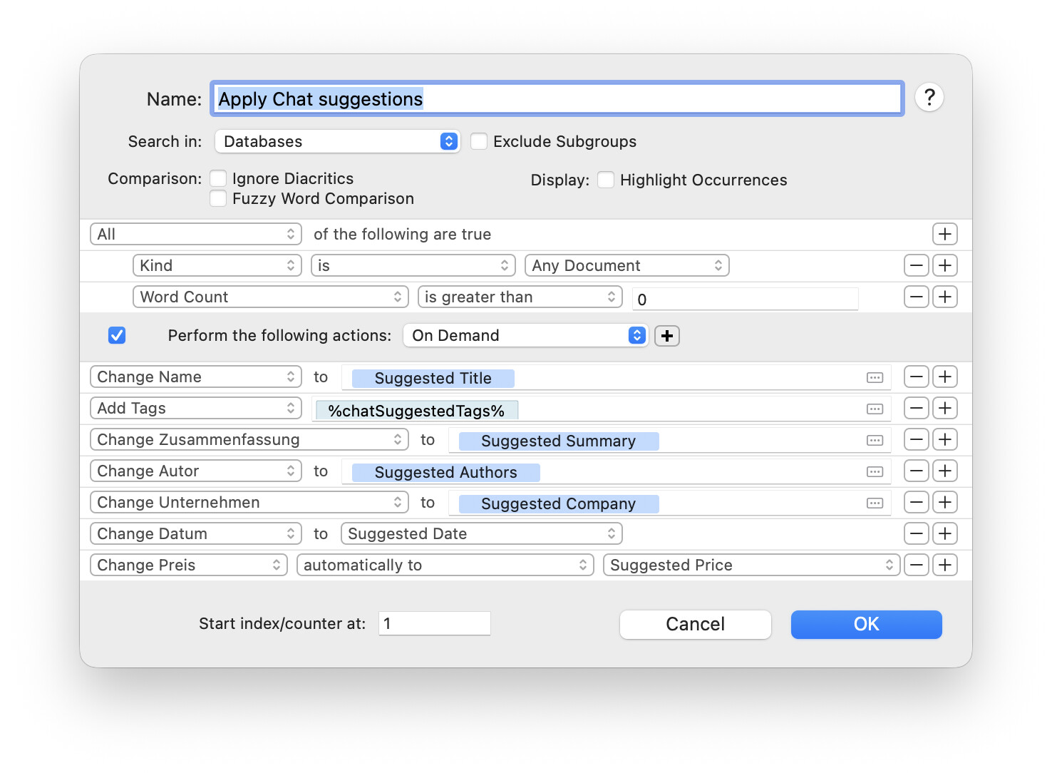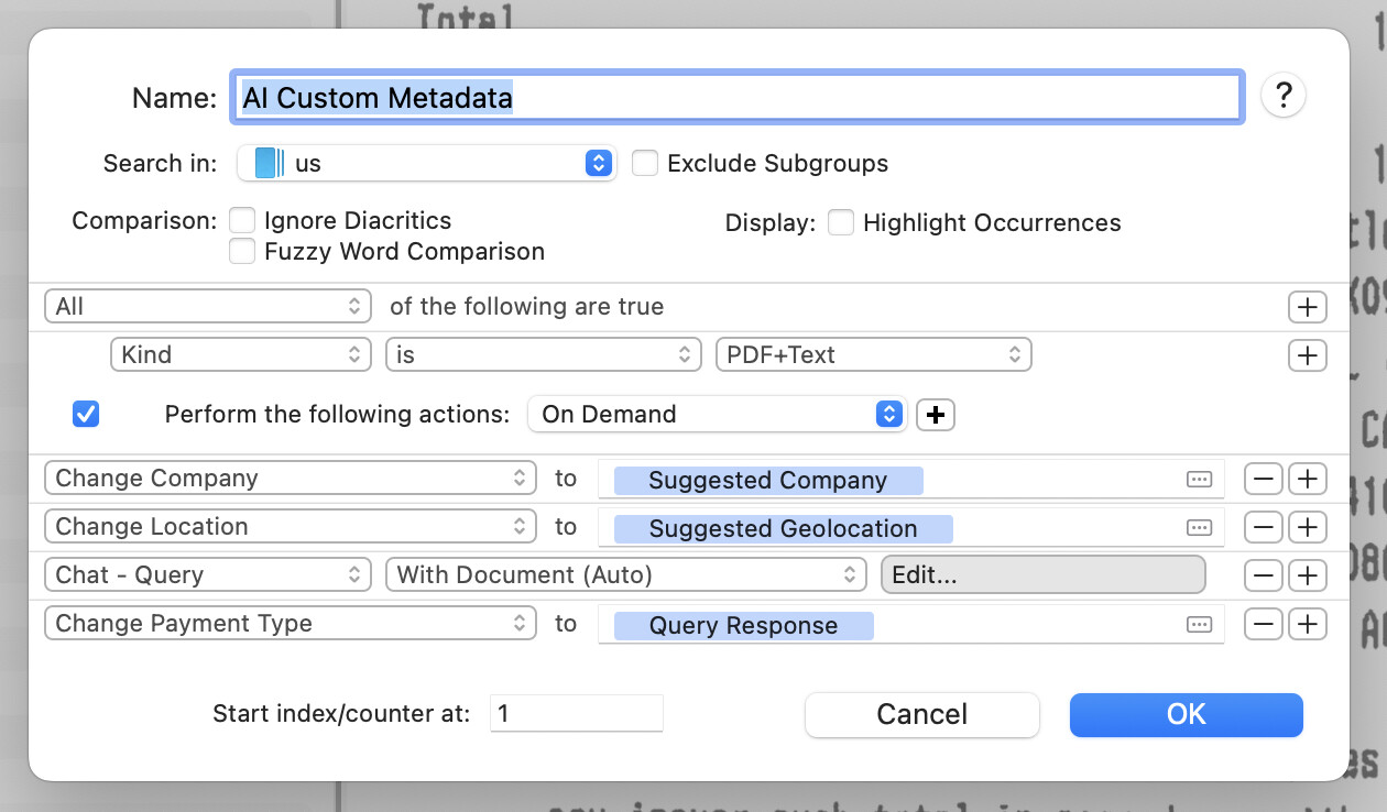 Very informative. I understand that I need to make a separate call to the model for each metadata field change, which would multiply the cost of model usage. It would be expensive if I had a rich schema of custom metadata, given that the free or local models don’t do a good job for such tasks at present. Is there a way, say, to use AppleScript to handle multiple metadata fields in a single query? If so, are there examples of such scripts that could get me started?