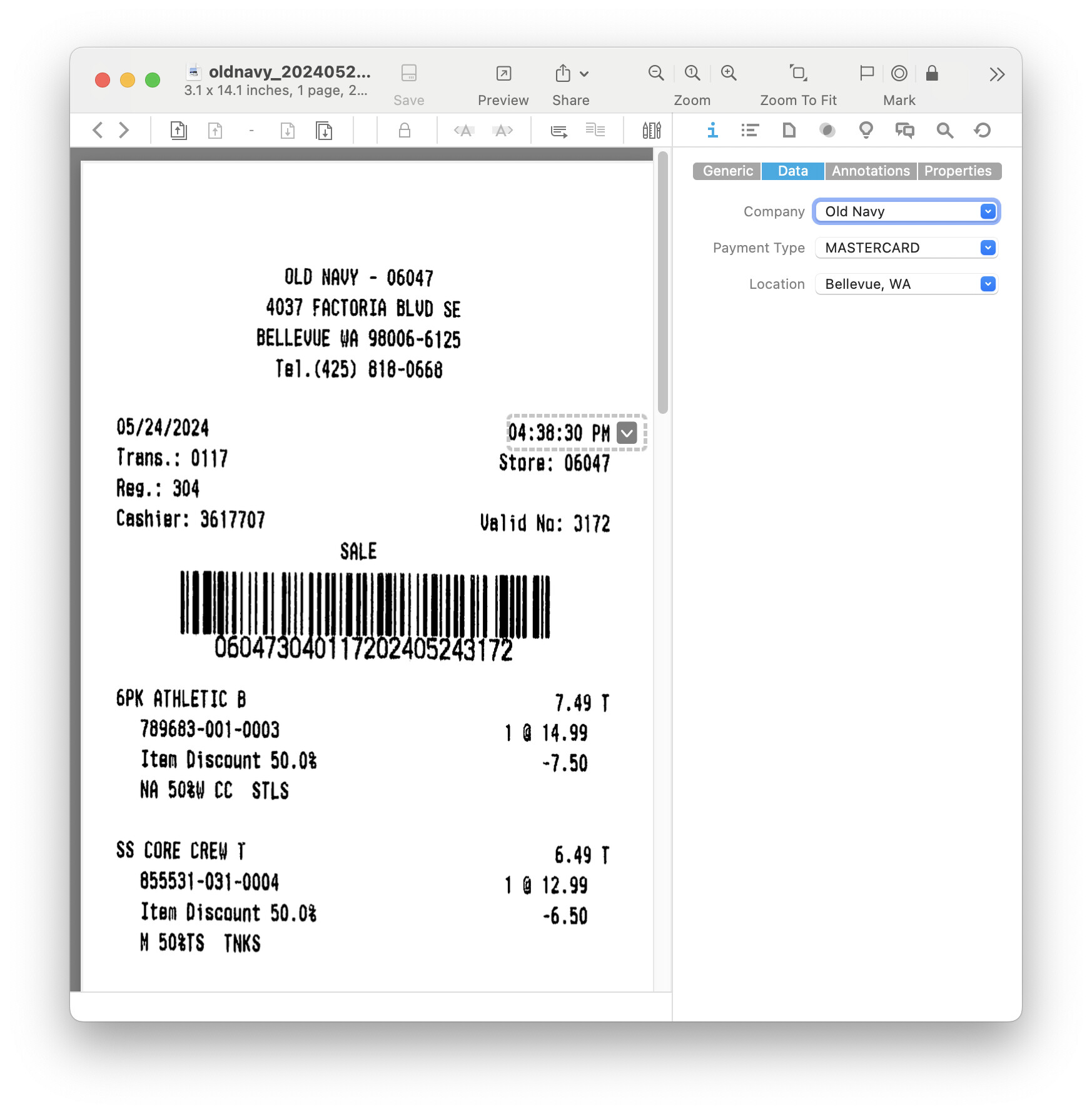 As a use case, I would like to implement something similar to the Devonthink community AppleScript for extracting receipt data and placing it in a custom metadata field, which can then be used to create an “Expense Report”.