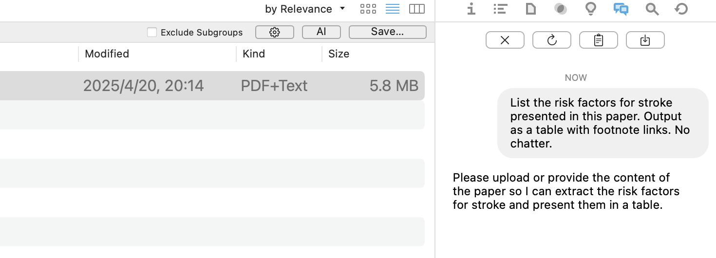 It seems AI inspector does not see the selected document. I tried both chinese/english pdf and md documents. But “summarize via chat” is working via “Edit“ menu.