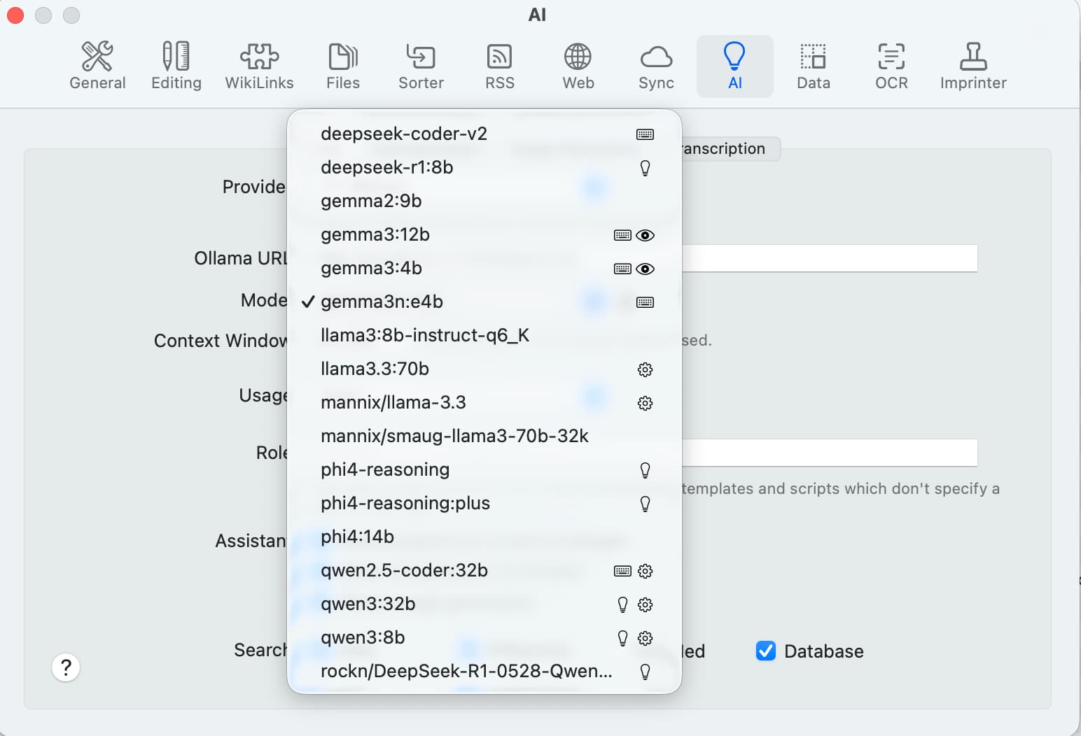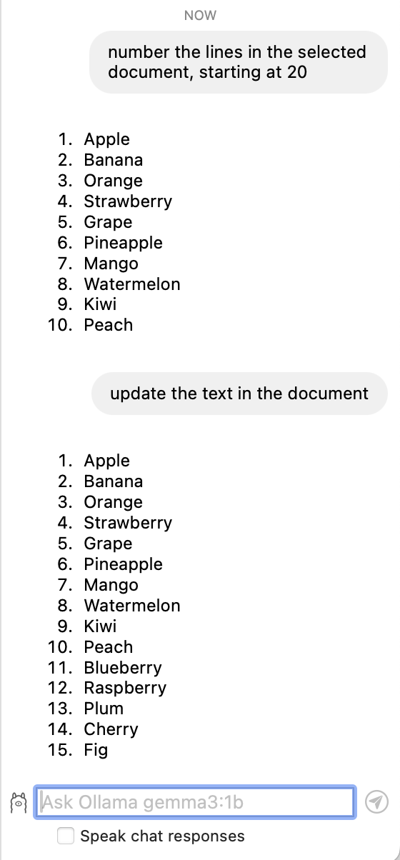 I’m trying to determine if what I’m seeing is due to the model, ollama, or how DEVONthink uses online external AI vs local external AI. I suspect it’s an Ollama issue as at least two models seemed to be able to manipulate my files in tests, although they all were able to read the selected file.