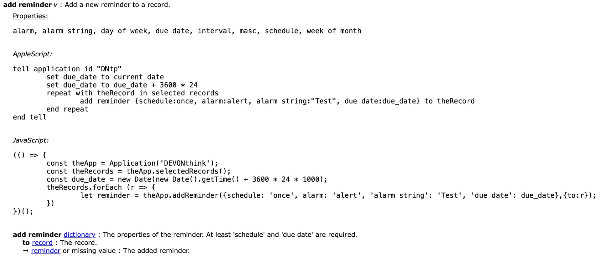 tell theRecord to make new reminder with properties {schedule:once, alarm:open externally, due date:theDateString}