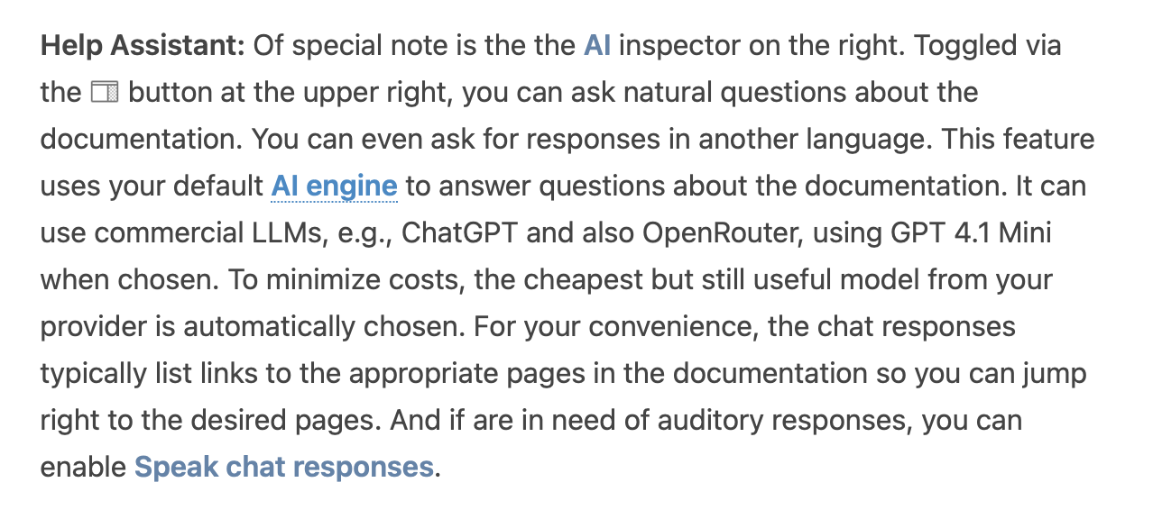 I was suggesting AI access to full text Users Handbook or approved and current reference material. AI chat from any point in the software should have current version context, not only while having the User Handbook or other approved document open besides the AI Chat box.