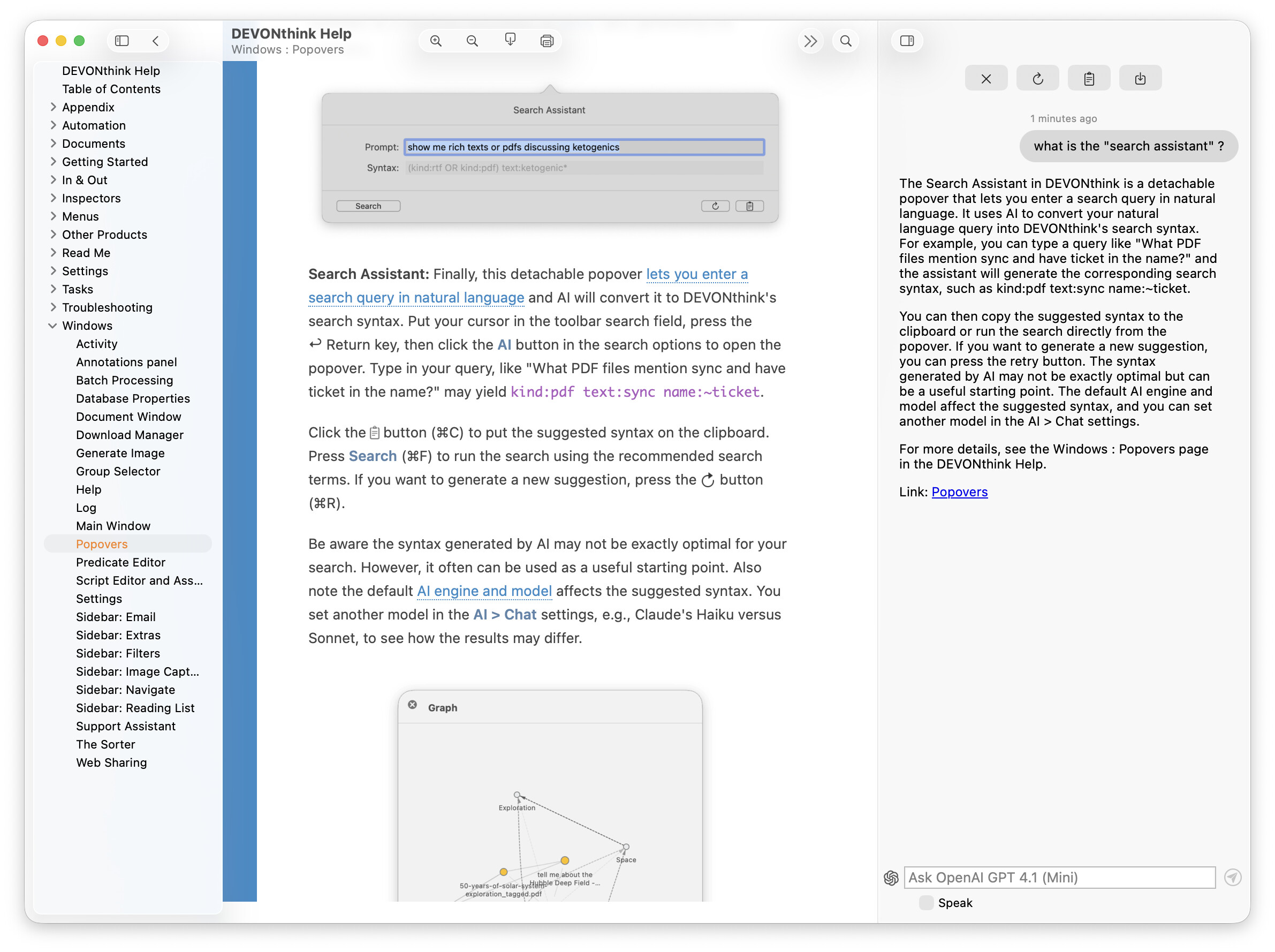 “DEVONthink’s help assistant” is not integrated with the AI. Its a search facility of your current version’s Release Notes. You can do normal word searches but not ask a question, as far as I saw. The AI was sitting on the right side of the open Release Notes document but the chat’s prompt field was blocked.