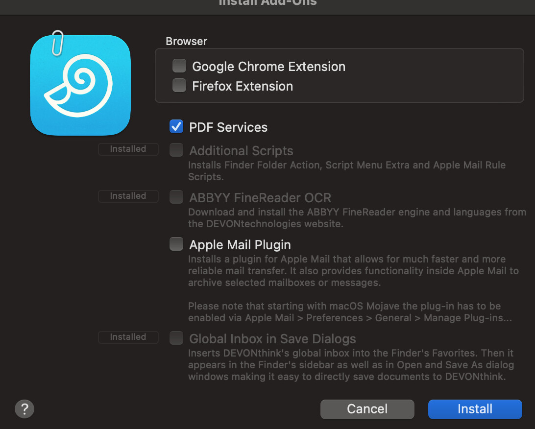 Under System Preferences >> Services, I do not see “DEVONthink - Import…scpt” options.
