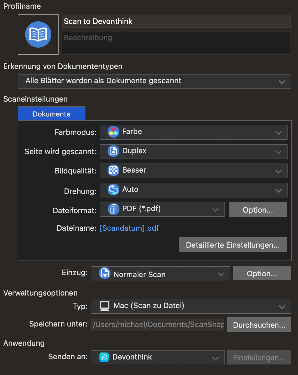Wird der Scan direkt an DEVONthink geschickt wie empfohlen oder nur im Eingangsordner abgelegt? Im zweiten Fall kann DEVONthink nicht erkennen, dass es ein Scan ist.