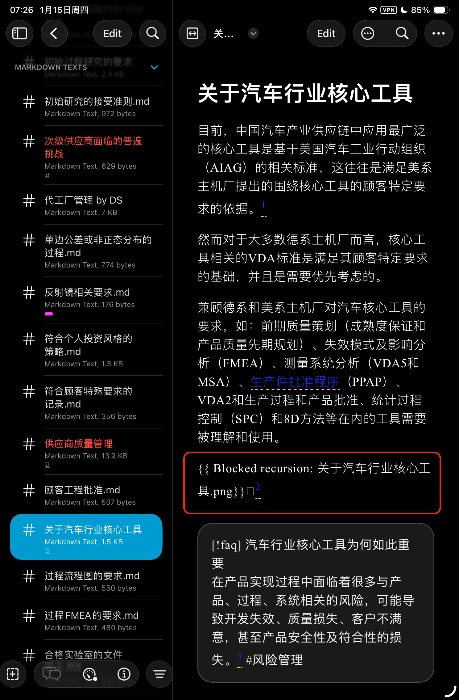 I inserted a picture file with the same name as the MD file into the MD file, which showed normal in DT 4, but Blocked recursion in DTTG 4. In addition, some Wikilinks are not displayed in DTTG 4, such as FMEA, SPC, etc.
