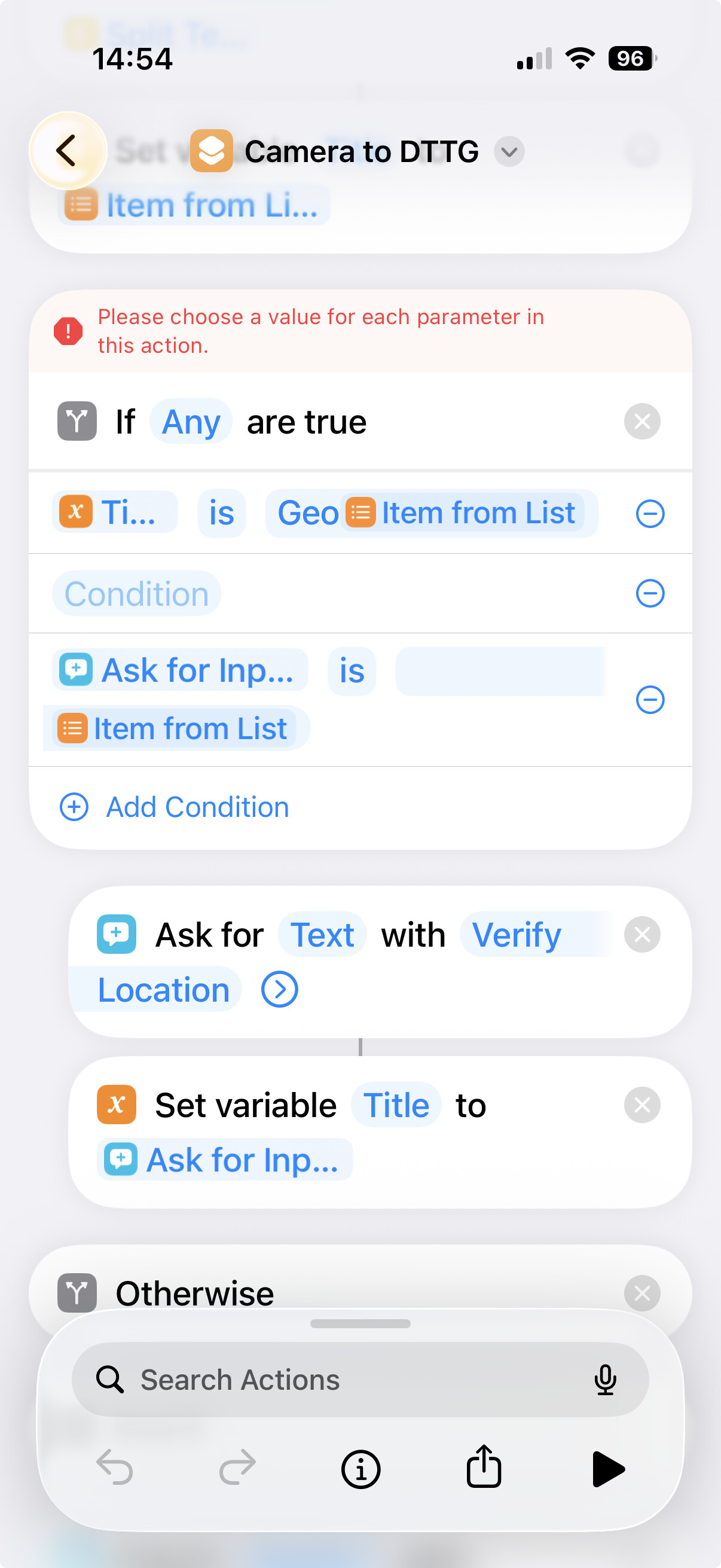 The shortcut is named Camera to DTTG. If I created this shortcut, I sure don’t remember doing it. I don’t remember creating any shorts ever.