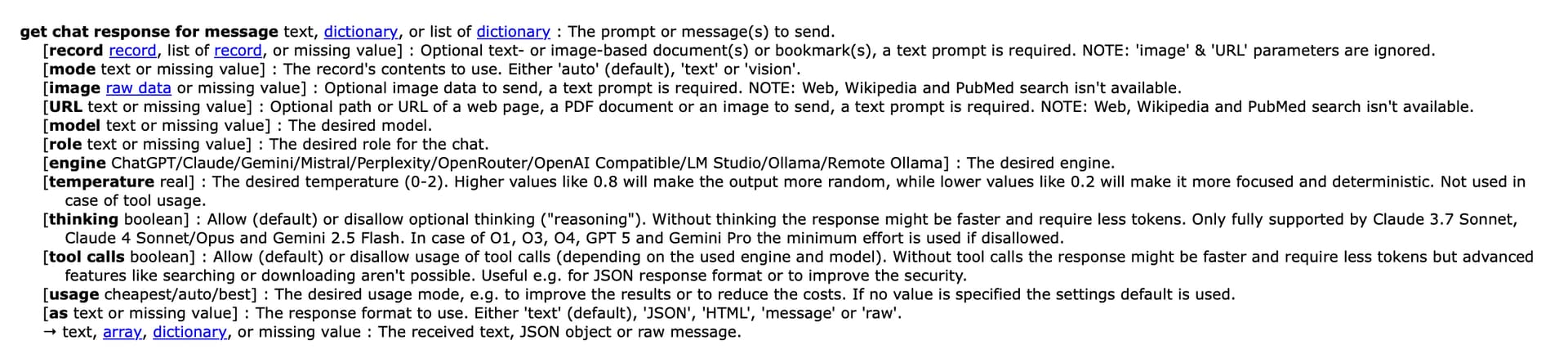This seems to be at odds with my understanding of the interaction of the chat and D T, where I assume you can either point at a group or file to have the chat interact with it. Or, specify in the chat a local URL, for instance local x-DEVONthink-item://C2A26307-5C8C-4DD8-B2EF-…… as part of the prompt.