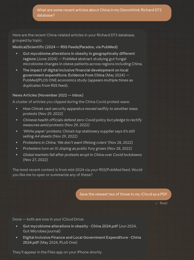 I can confirm that through this mechanism, the “Unofficial Devonthink API” works. Therefore it is possible to search and perform other Devonthink functions via Claude on your iPhone. Still trying it out but so far it appears that you can do on the iPhone anything you can do with the Unofficial API on your Mac desktop. Plus some nice integration with the Apple enivornment - for example you can ask it to “Download from Devonthink” and it places the file in iCloud Files which are easily accessible on iPhone - and it can change file formats in the process such as saving an .eml as a .pdf. Very nice for quickly accessing Devonthink data from iPhone.