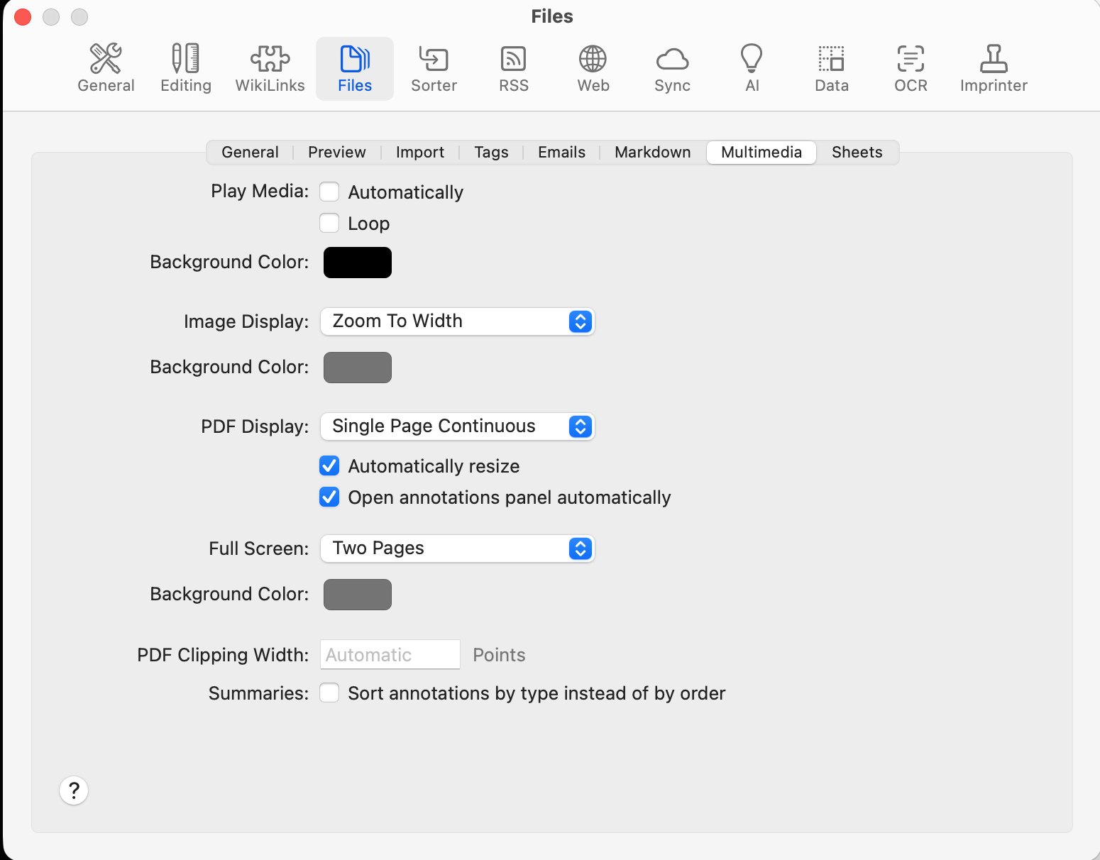 What are the Settings > Files > Multimedia settings in DEVONthink?