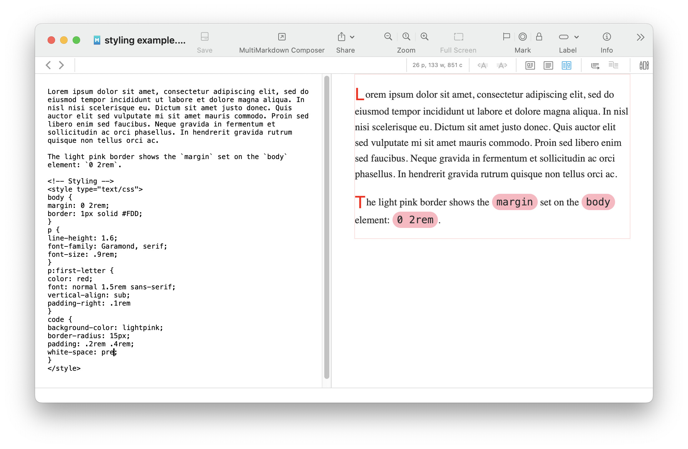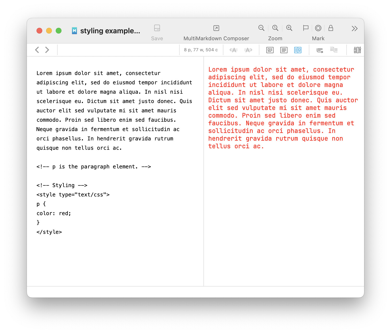 I also discussed different styling methods briefly in the Documents > Markdown Documents > Styling section of the built-in Help and manual.