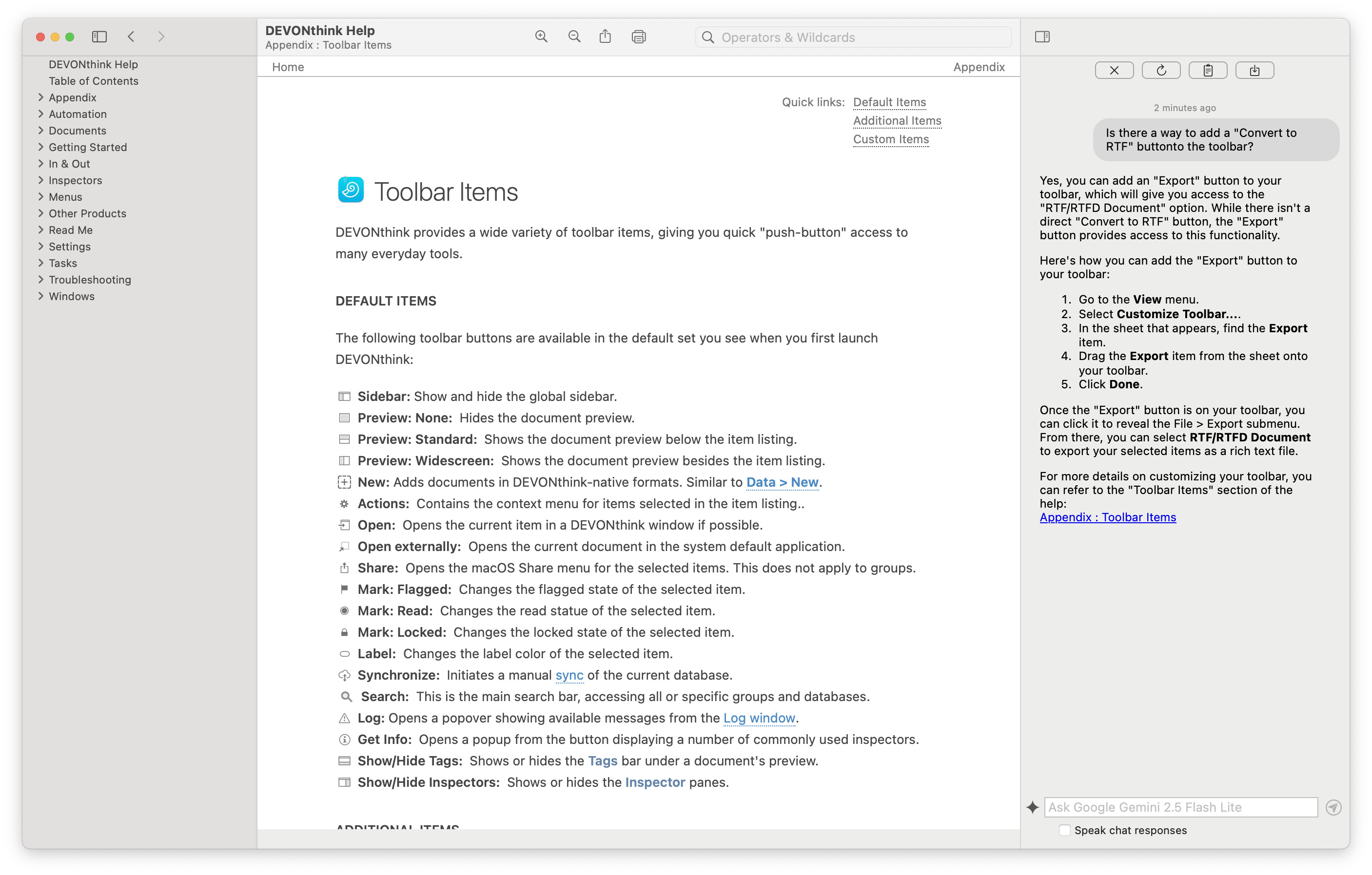 I like to use Ollama to access local models. It can’t be used in the Help Assistant. I created a Group specifically for Devonthink help. I put the manual in there and select it for context and then run whichever model I want in the AI info panel. It supports the other commercial models obviously as well. Then save those conversations into the same group if I want to refer to them again or even use them as context for continuing the conversation. That might be one alternative to consider if you want different models.