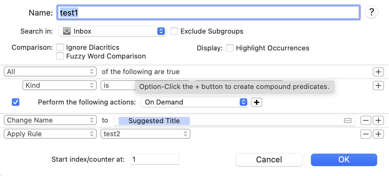 I found a bug in DEVONthink’s automation: If a rule contains an AI operation and it’s used by another rule that also has an AI operation, it can’t batch process files. After handling the first file, the automation process crashes. Here’s my test rules: