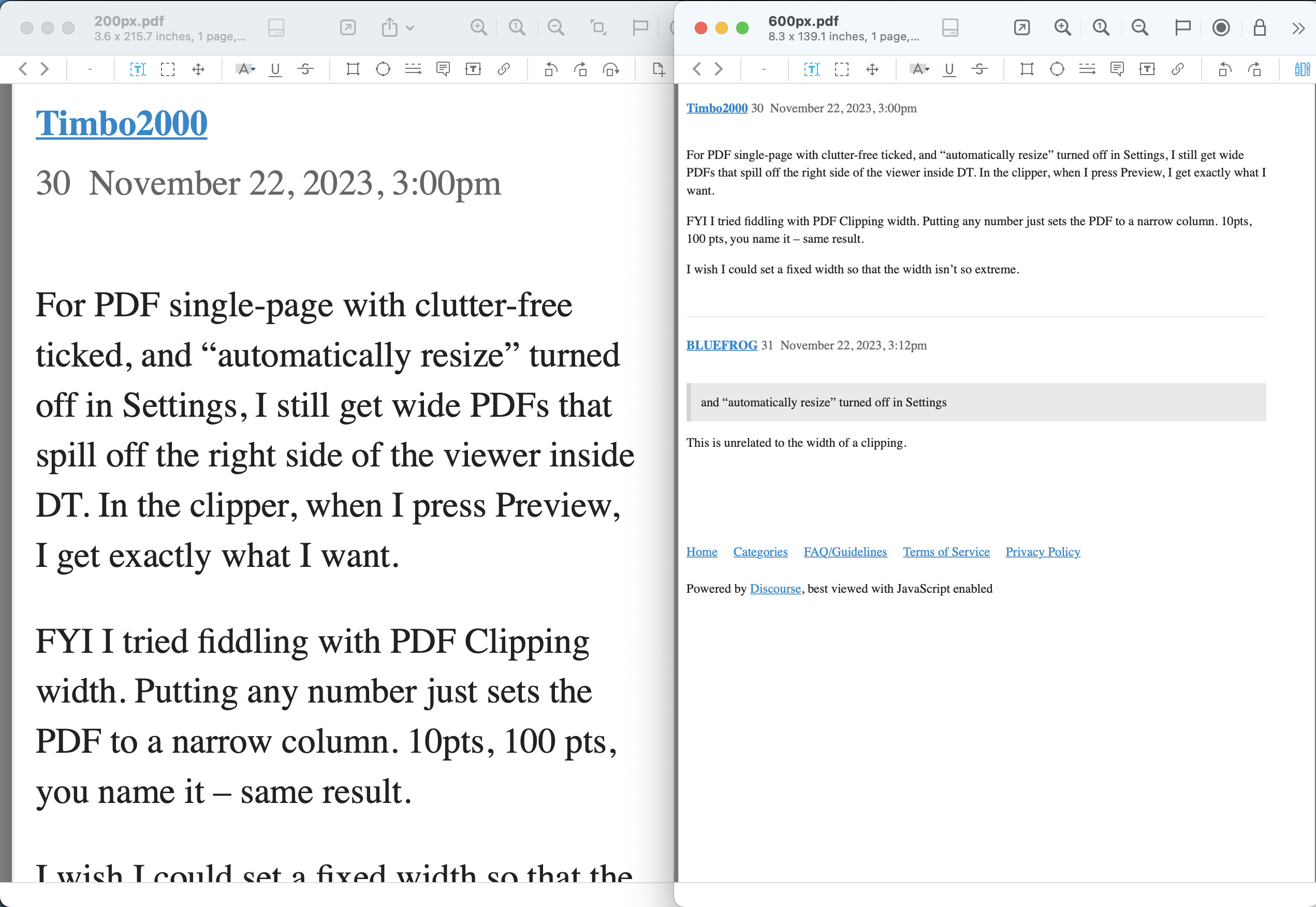 For PDF single-page with clutter-free ticked, and “automatically resize” turned off in Settings, I still get wide PDFs that spill off the right side of the viewer inside DT. In the clipper, when I press Preview, I get exactly what I want.