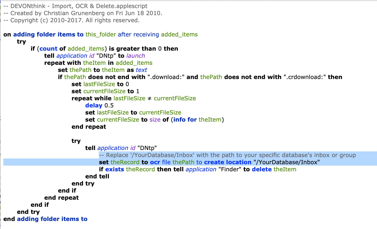 Since the last ScanSnap update, it can now save the scans directly in folders on the NAS (without the diversions via cloud services such as GoogleDrive). For the automatic import of scans that end up in such folders to DevonThink, there is the folder action Apple script “Import, OCR & Delete” (right-click etc. to attach to the corresponding folder), which I would like to use. However, all scans imported in this way end up in the same global inbox.