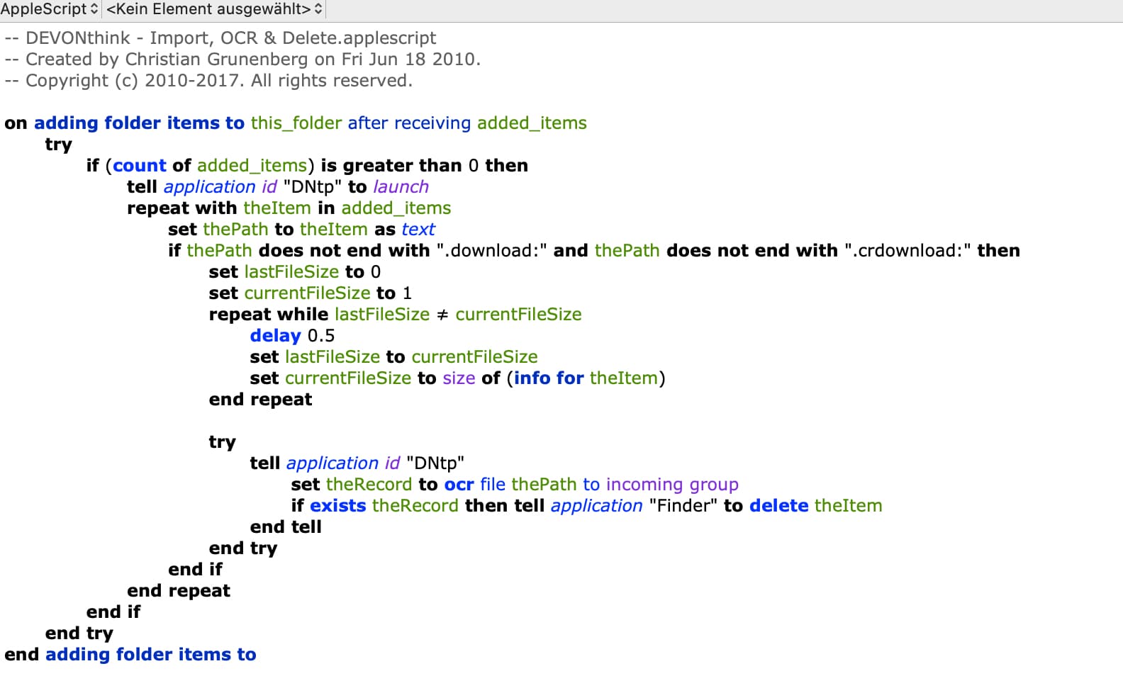 I am explicitly looking for a solution with the “Folder Action” mechanism. The mechanism with Indexing & Smart Rule is known to me, I implemented it 2 years ago and it basically works, but unfortunately the reliability is not 100% and the solution does not seem to be the best in terms of elegance, because it only checks every minute if a new file has been scanned, and not directly on receipt. I’ll see which of the two solutions works better in practice.