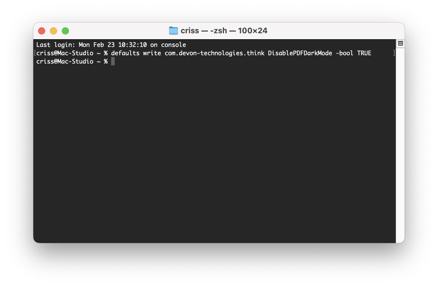 $ defaults write com.devon-technologies.think DisablePDFDarkMode -bool TRUE