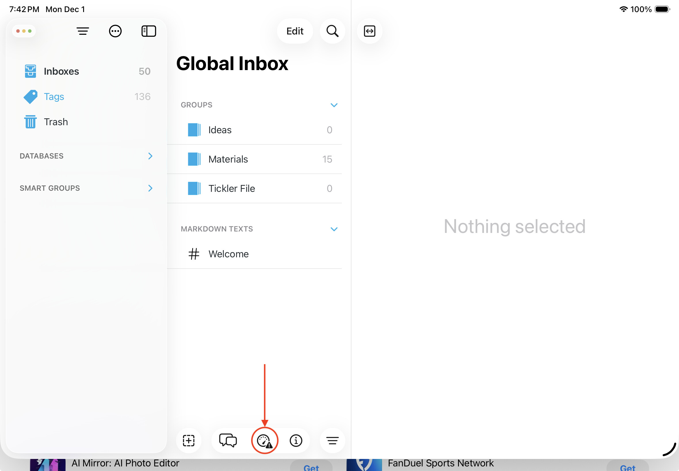 Bottom toolbar where. I have three panes visible and no warning triangle in any of them. In the first pane I select the icon with tree dots and select sync. Nothing happens