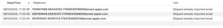 Here’s a screenshot. It does it for every email I import though so I’m not sure how helpful this screenshot is! (I drag and drop the emails I want to save from Mail to the relevant group in my database.)