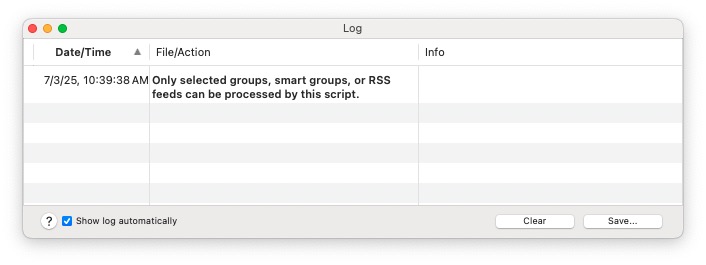 I tried using the script in four combinations: when a (regular group / local smart group) is (selected / opened in a window). According to the descriptions of the script, all four scenarios are supported, but during my tests all four resulted in the same log message above.