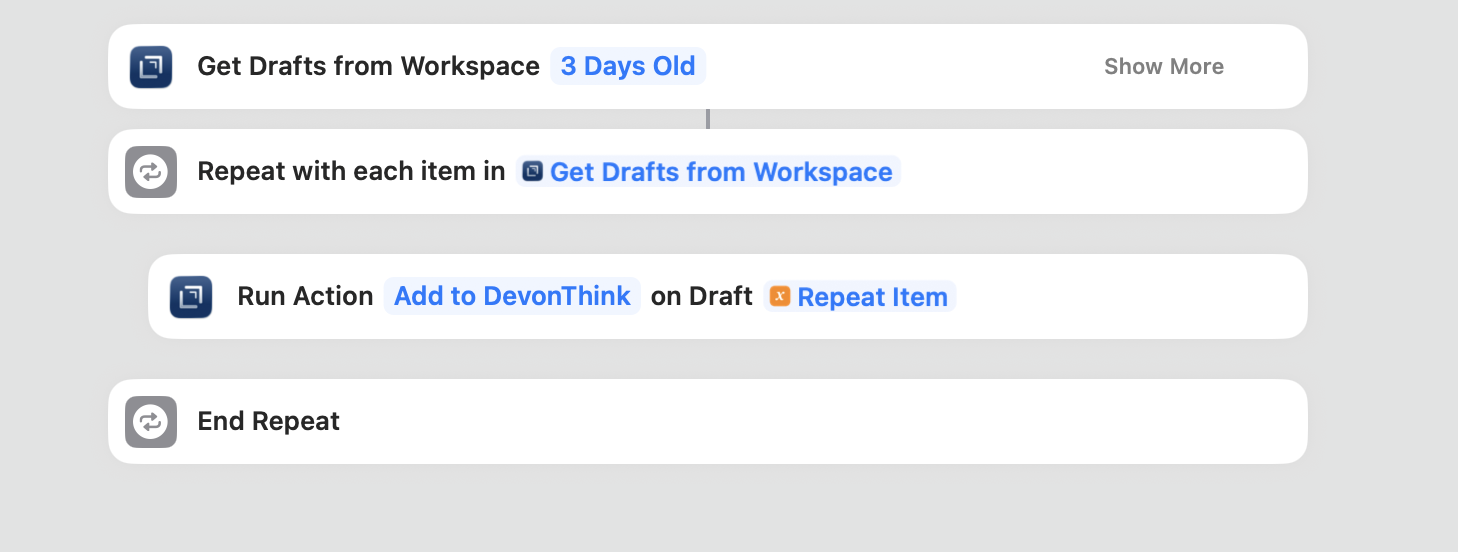 So I use an action to send all my notes to DEVONthink’s Global Inbox; tagged, so a Smart Rule can move them to specific locations. Unlike @cornchip I don’t delete the notes in Drafts after sending them but I have set the action to move them to the Archive and tag them “DEVONthink” so I can easily look them up if ever necessary. This is nothing at all like sync or indexing, just an additional backup.