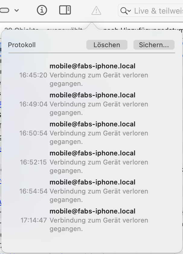 I deleted the sync-store on the iPad, tried it new with Wifi and USB, restart everything, switched off all databases except for one, changed order of - no chance - spinning circle on iPad and no sync. The cloud-icon shows no triangle. Mac log shows lost connections to the iPad while showing „mobile@nameofmyipad.local“ as file/action. _devoncloudy._tcp ist all the time active (Discovery) with my Mac as the one and only entry - HostName of my Mac shown there is of the form devicename.internal-domain.local.