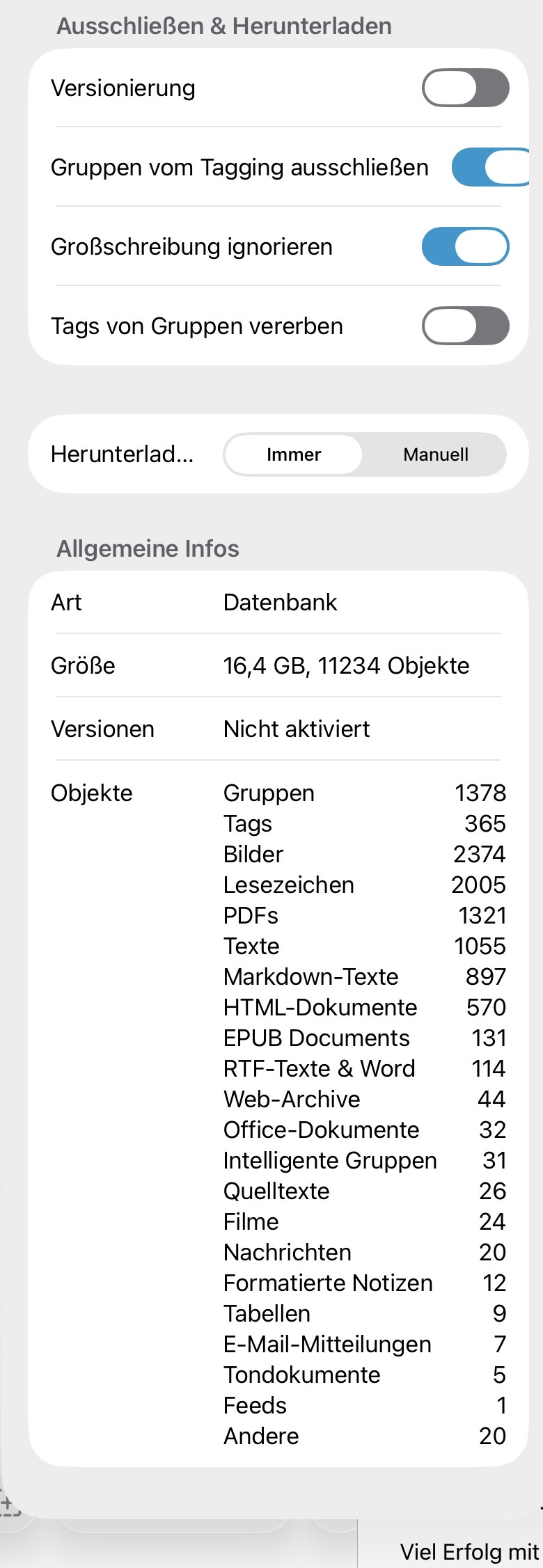 Hi all, I am using DTTG 4 since a week or so on my iPad Pro M1 with 128GB. My databases sizes are 37GB in total, the largest one is about 16GB and i have 23GB RAM left on my ipad. Working with DTTG is terrible slow, the UI is often not responding and sometimes I have glitches when the ui is changing. Sync is over webdav with my webhoster. On my Mac I am using Devonthink Pro 4. All on latest version.