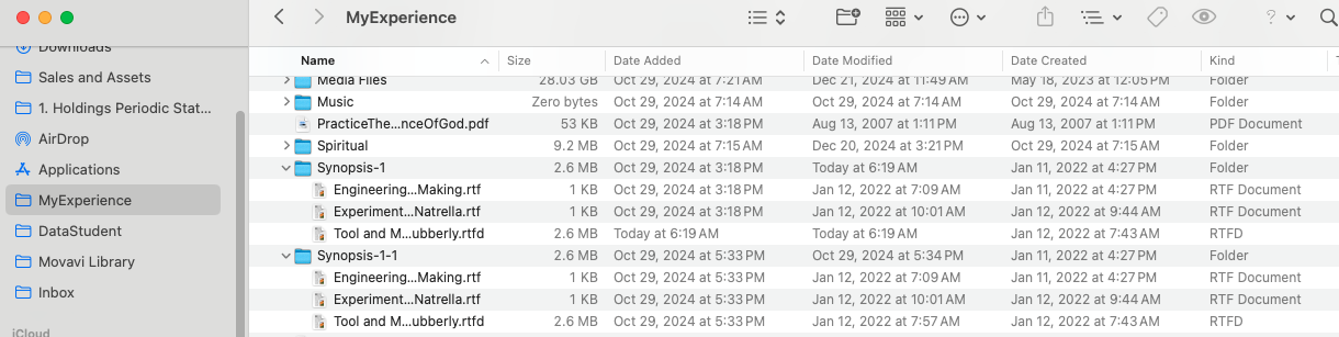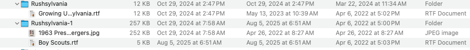 When I checked OS there were also 2 folders, the original with the -1 suffix and a new one with a -1-1 suffix. The only difference I could tell was in the Added and Modified dates of the .rtfd file. in the -1 folder the Added and Modified dates were today’s date, while in the -1-1 folder the Added date was October 29, 2024 and Modified date was January 12, 2022.