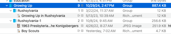 I noticed one of the groups in my Index had a -1 suffix (Synopsis-1). I don’t believe I added the suffix. I checked OS and its folder also had the same name as the group (Synopsis-1). I then opened that group this AM and did some editing of a .rtfd file in it, clicking on the photo in the file .
