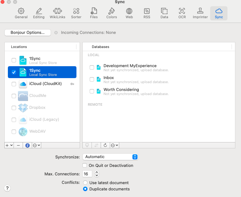 I’m attaching a screenshot of my Sync Locations and Databases. Looks like Conflicts is set to Duplicate Documents. But I don’t know what that means.