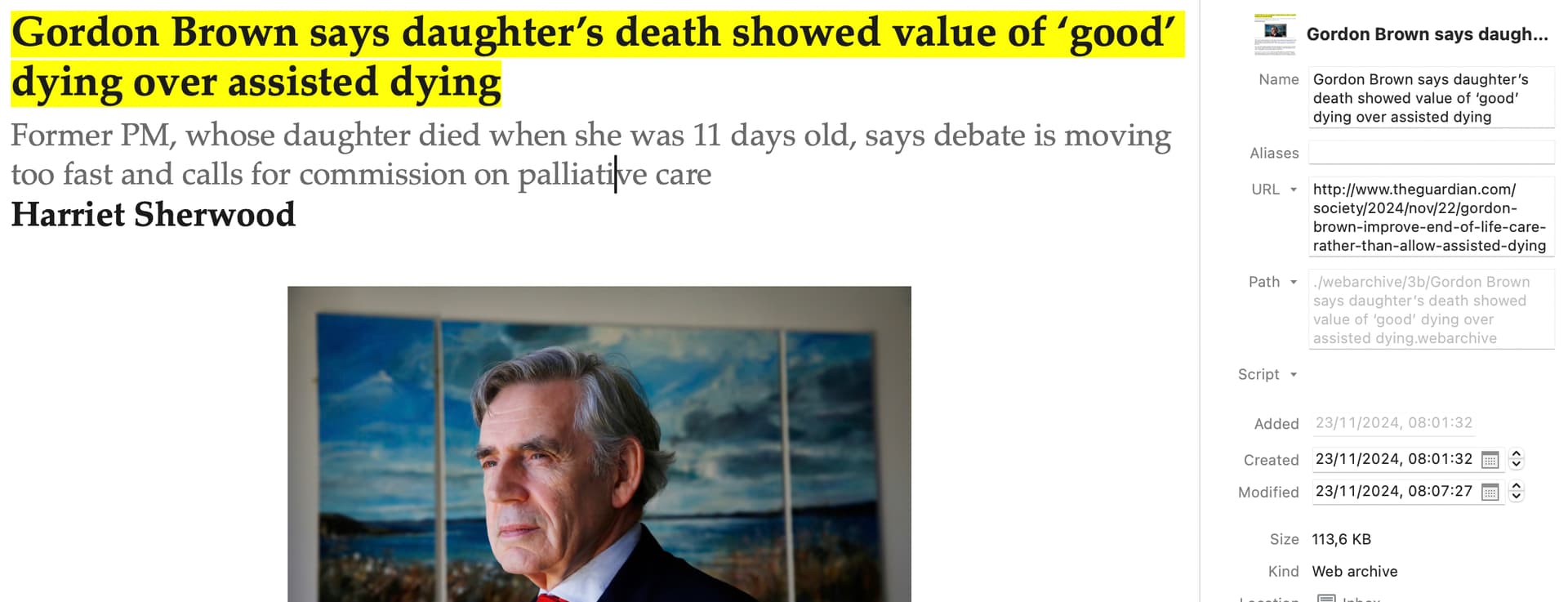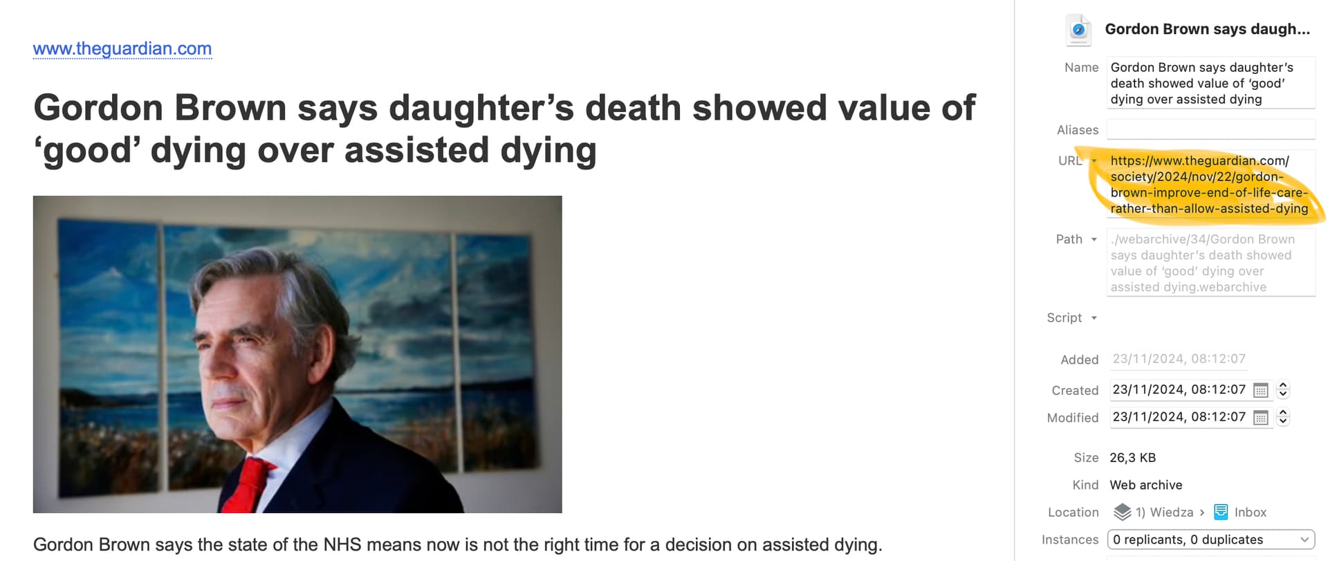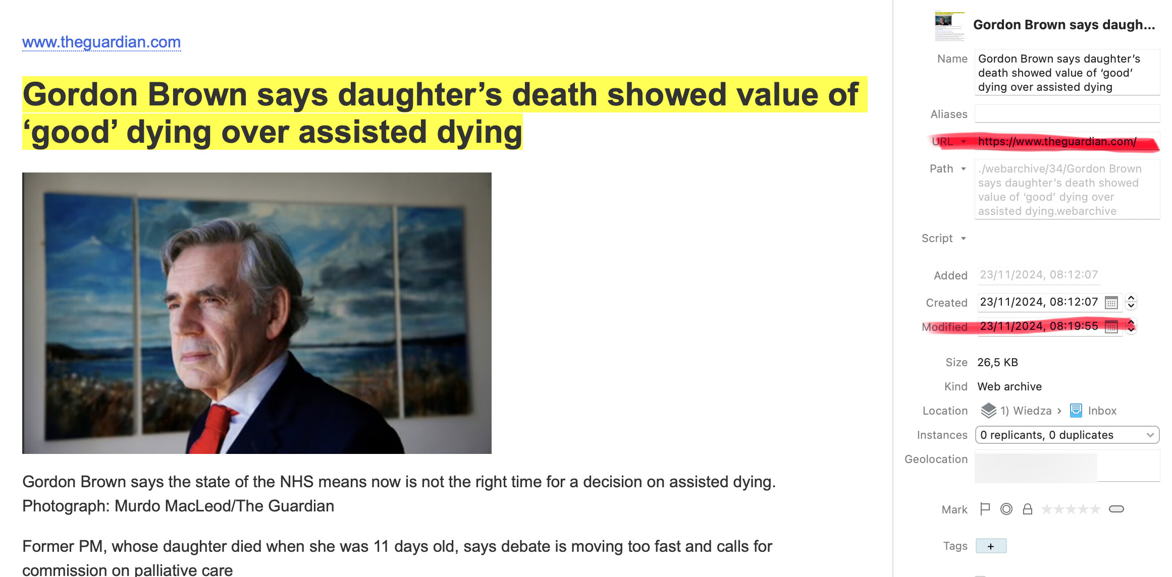 If I now edit anything in the captured web archive, and save the file, the URL in the “URL field” remains correct (in the example below I highlighted the text of the title using DT editing tools):