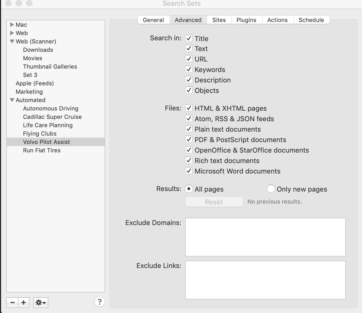 I have a set of automated DevonAgent searches which send results to DT3. These are typically configured as “Express Search” with multiple plugins including Google and blogs.