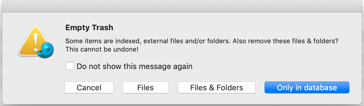 What exactly does each of these buttons do? (I have an indexed [not imported] folder that I no longer want, and moved it to the Trash. When I went to empty the trash, this dialog box appeared, and I don’t know what the buttons will do. I want to ensure that none of these actions will actually delete the files on disk.)