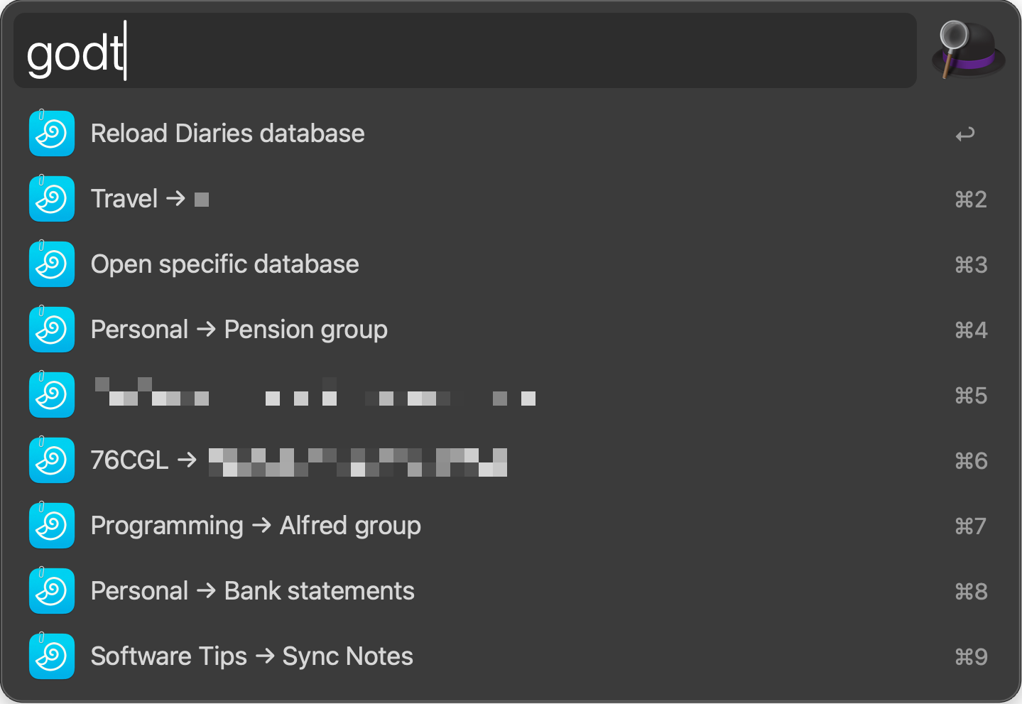 All I have to do is to type the keyword GODT in Alfred’s window and the menu appears—with items sorted with the most recently used at the top. (Obviously most of the items in the list link to DEVONthink Item Links. Reload Diaries Database links to a short AppleScript that closes all DT windows and reloads my Diaries database with the current year in focus in the navigation bar. Open Specific Database links to a further List Filter listing all of my DEVONthink databases—with appropriate Item Links to them.)