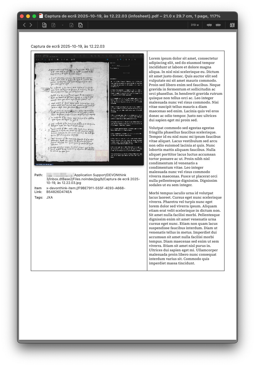 Opening the image in a document window, with the transcription in the annotations inspector—like in your first screenshot—seems much more functional to me. Why the PDF? (If it’s for sharing, why include the file path and item link?)