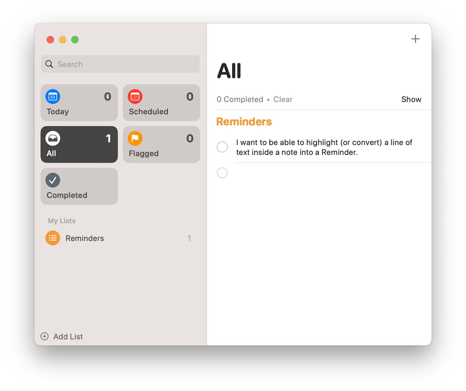 I want to be able to highlight (or convert) a line of text inside a note into a Reminder. Via script, I can turn an entire message into a Reminder (handy), but I would like to do this inside my research notes. This would let me create reminders anywhere but manage them inside my Reminders workflow.