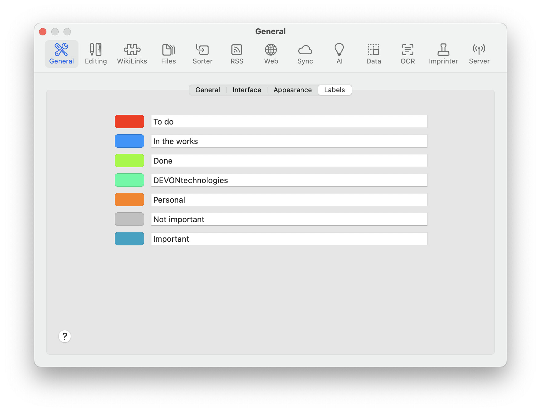 If I needed something like your pink tag (“must be tagged”), I’d use a smart group: Less work, since the document will automagically disappear from the smart group as soon as it is tagged. I have to manually remove a label. The same goes for “complete backlinks” (green).
