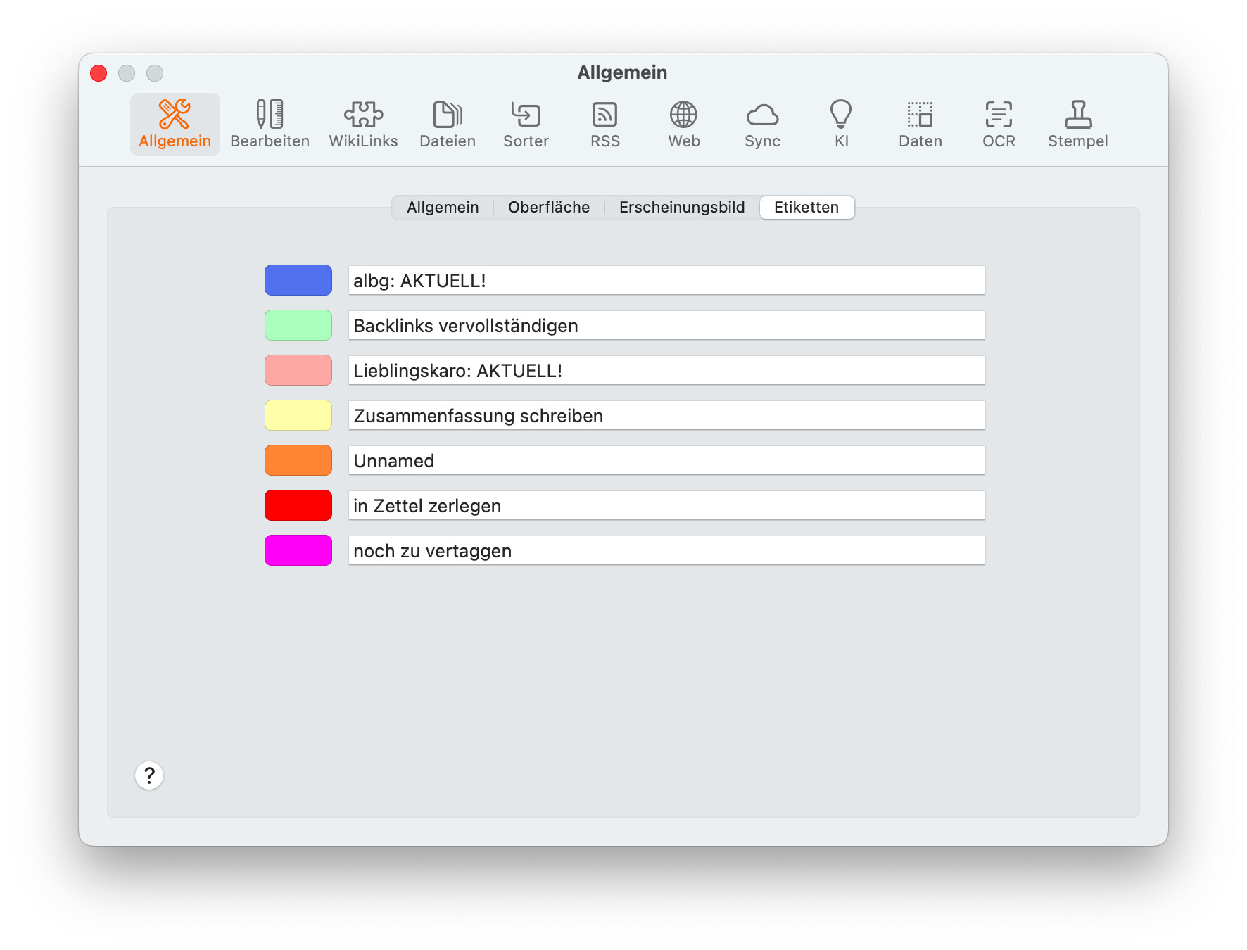 So albg and Lieblingskaro are two companies I’m involved with. Backlinks completion, Abstract writing, and "cut into Zettel” have to do with my Zettelkasten. And the rest is unused, actually. But as I said, this does not help me, I’m almost not using it at all.