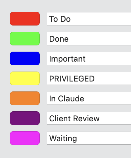 Here is my set up. To Do and Done are extremely ephemeral, as they change all the time, with “Done” really just being to note I did whatever I planned to do with the file in a given work session. Files don’t stay labeled “Done” for very long. In Claude is kind of not used because I have started replicating files to another group in my projects, though the Orange label helps to see on sight what’s been thrown at AI and what hasn’t.