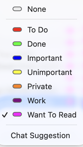And a thought… the label and color aren’t intrinsically tied together. There are times I use a red label, not because it’s To Do, but because it’s very visible. So the color can just be used to make something stand out. It doesn’t necessarily have to match the label name. Unless you’re working in a collaborative setting where everyone agrees to and adheres to specific colors and meanings, you use them how they suit you.