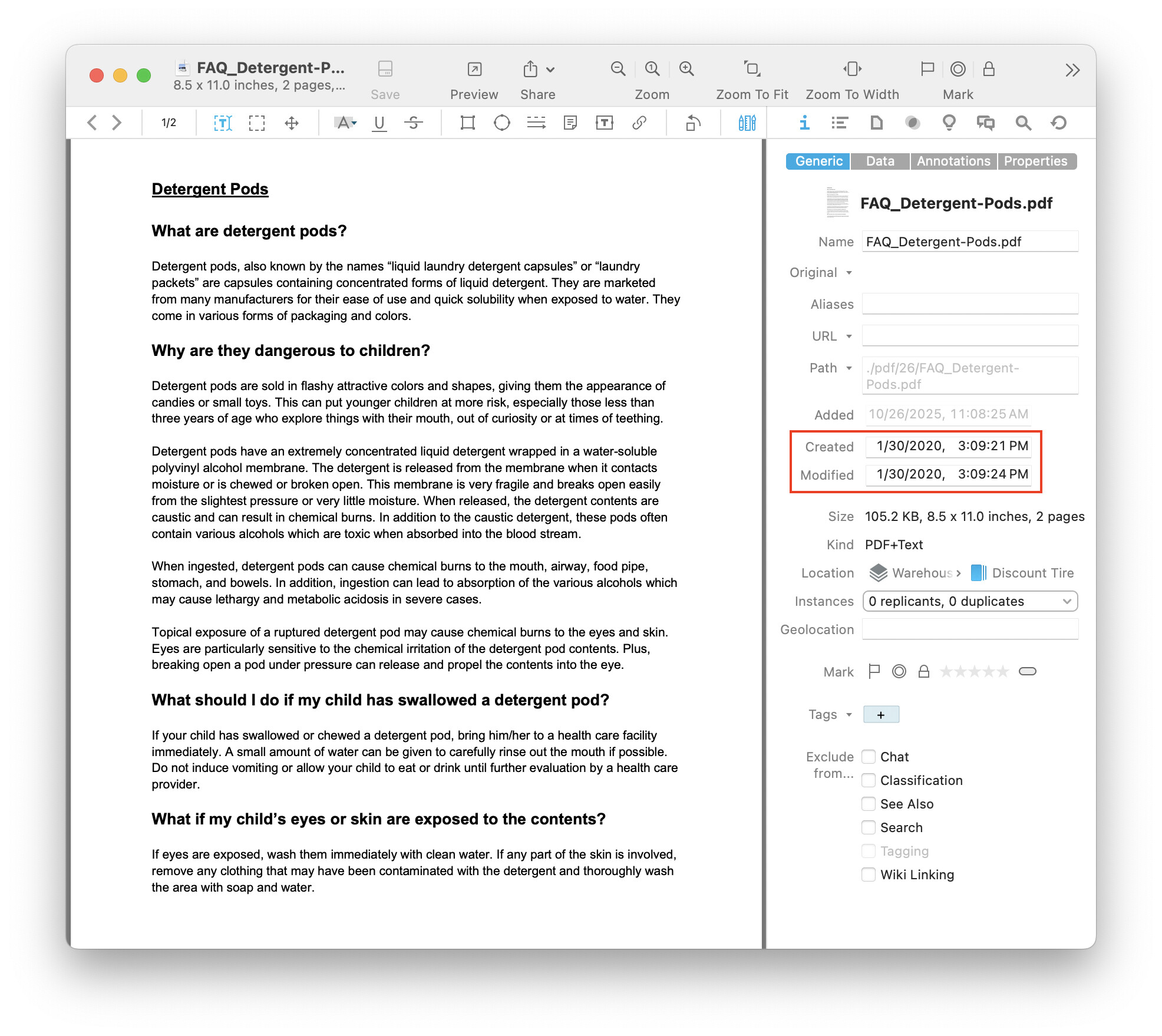 However, the actual date of creation and modification is years ago. With Files > Import > Use content creation and modification dates enabled, the PDF document properly shows 1.30.2020 for those dates.