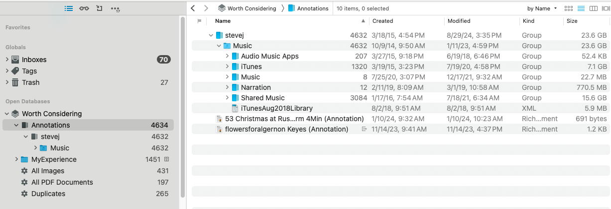 I don’t use annotations much, but today I just started checking the Annotations Group in my database. I don’t think I’ve created any annotations in DT3. The group has a couple of annotations I’d made on files that are on my hard drive, but they are not within documents of my current database. But the group also contains 5 folders from my hard drive Music directory, they have about 26GB of files and none of them are annotations. They are the actual files that are in the folder on the Mac. It looks like the full content of each Mac folder is in the DT3 Annotations Group. I was going to try just trashing the folders in Annotations (not the actual files), but wanted to here from other users. Any idea how or why this happened? Should the scope of annotations be just the current database files or is it all the files on my hard drive?