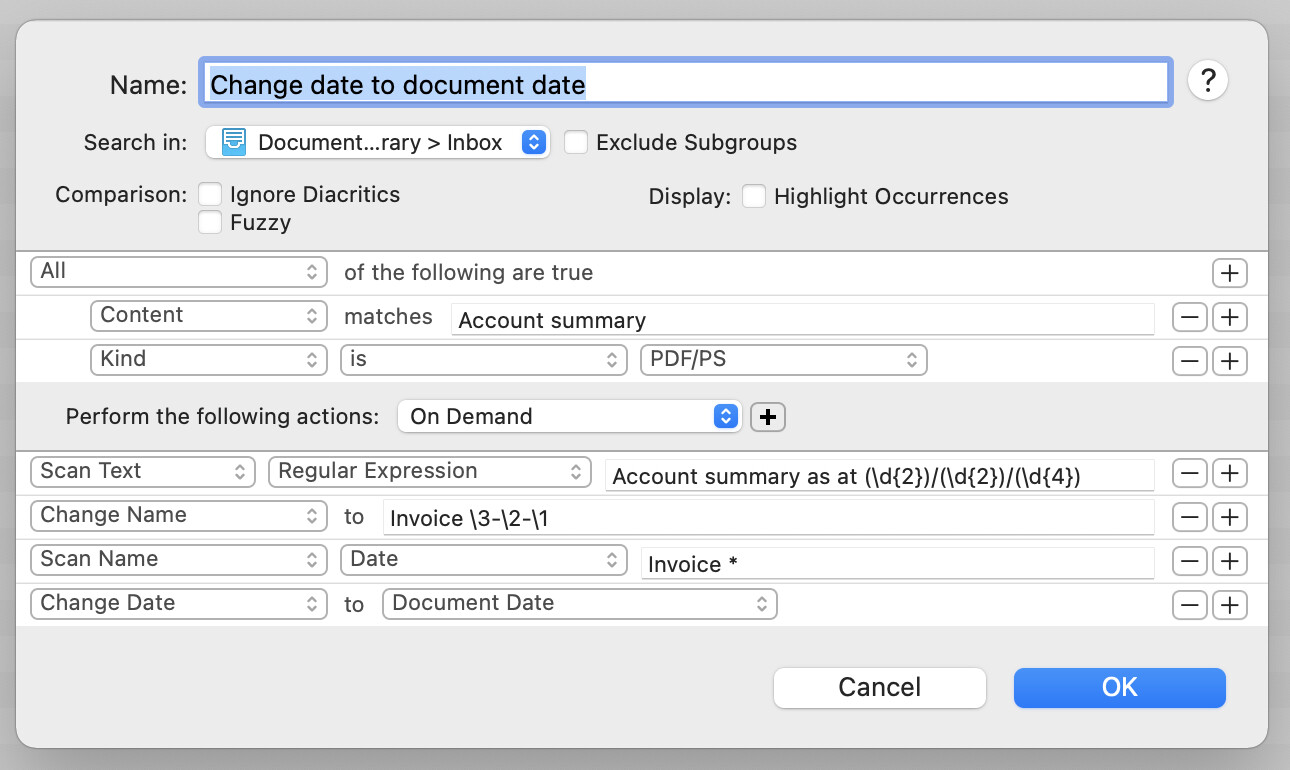 Finally, I scan the document’s name for a date using Scan Name.