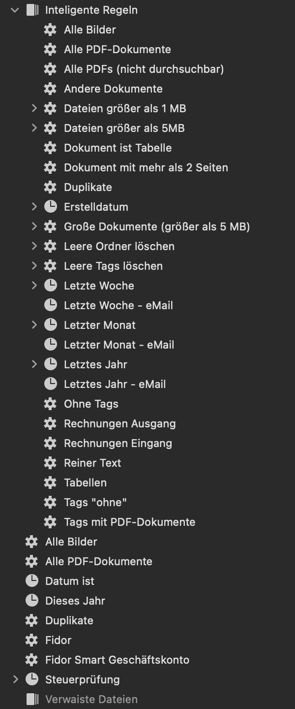 Ich baue das Ganze nun Schritt für Schritt neu auf. Dabei ist mir aufgefallen, dass eine von 4 Datenbanken einen Ordner mit intelligenten Regeln enthält. In diesem Ordner habe ich rund 30 Regeln gefunden.