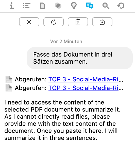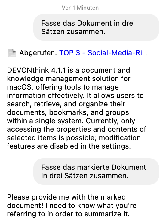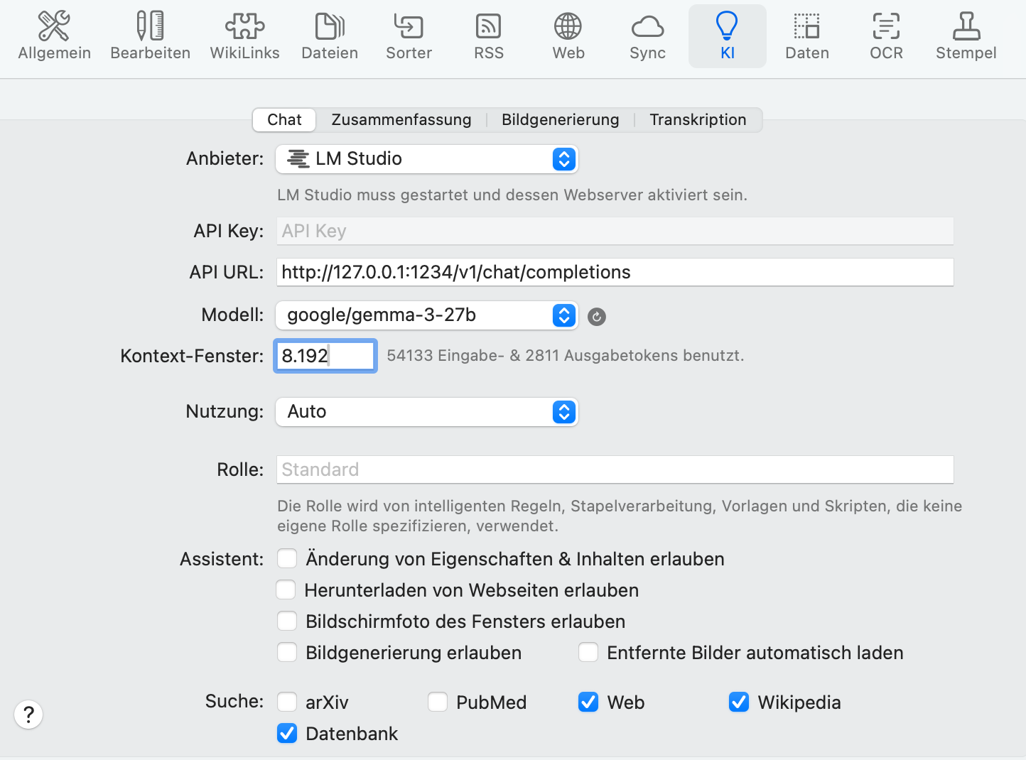 LM Studio is up to date. With Gemma 3 4B, I do get responses, but they are not very helpful. All in all, the current integration of local AI models is not easy to use (at least for me …), and also the use cases seem quite limited. My favorite vision for the future work with DEVONthink and AI is a kind of local notebookLM.