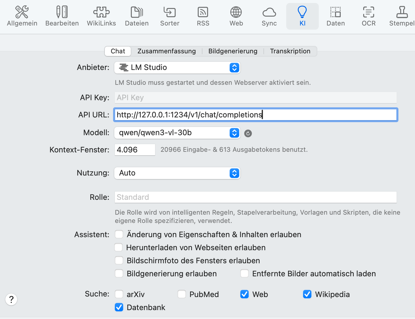I failed to set up the AI integration using LM Studio. The local model is running and usable within LM Studio, but requests from DT are not working.