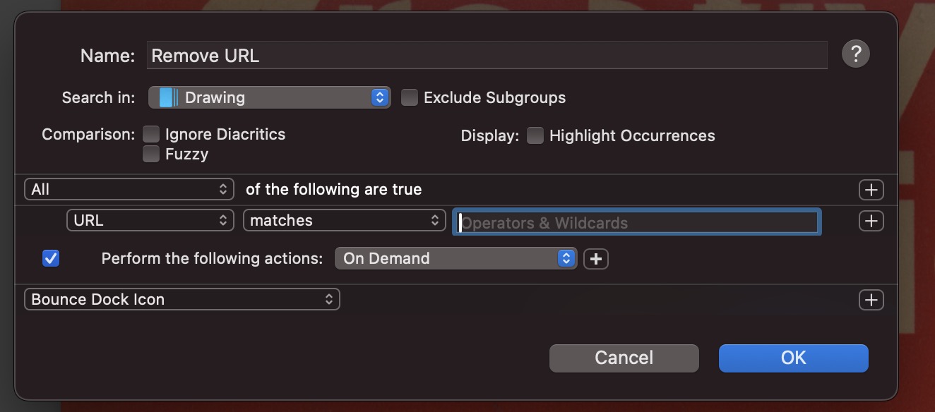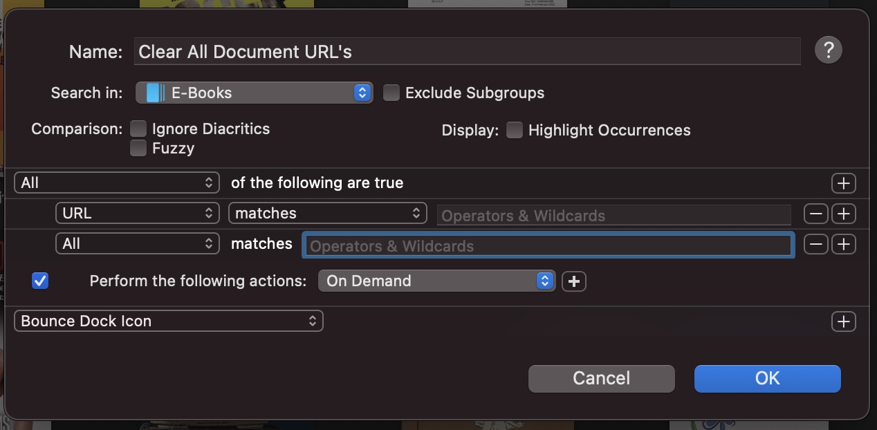 Just to point out why this isn’t doing what you want. I think this rule looks in E-Books for documents without a URL and All matching nothing (I’m not sure this matches anything). When you activate the rule the dock icon bounces.