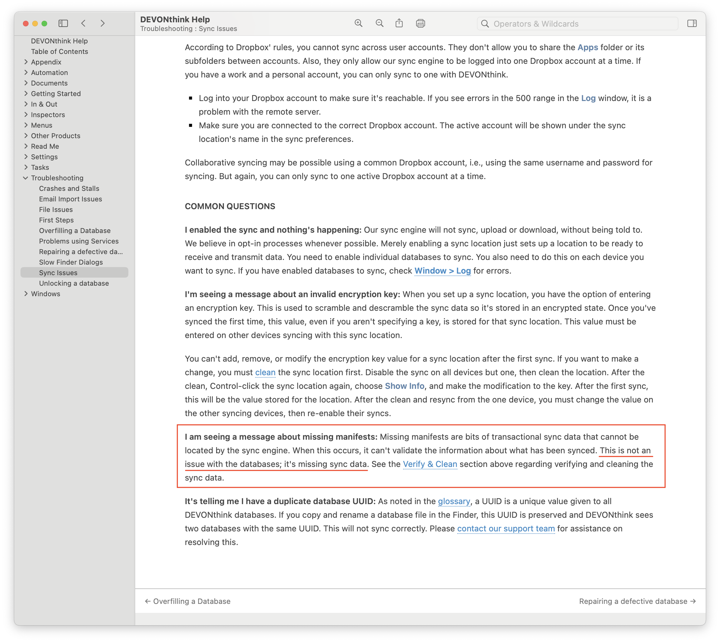 I am seeing a message about missing manifests: Missing manifests are bits of transactional sync data that cannot be located by the sync engine. When this occurs, it can’t validate the information about what has been synced. This is not an issue with the databases; it’s missing sync data. See the [Verify & Clean](file:///Applications/DEVONthink.app/Contents/Resources/DEVONthink.help/Contents/Resources/pgs/troubleshooting-sync.html#verify) section above regarding verifying and cleaning the sync data.